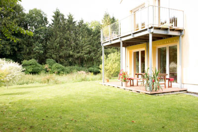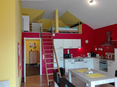 In der Ferienwohnung Kornelius II kommen ganz gemütlich bis zu 5 Personen unter. Sie liegt im 1. Stock und hat einen großzügigen Balkon mit Blick ins Grüne. Vom Flur aus gelangen Sie in das Schlafzimmer, das Badezimmer und die Wohnküche mit Schlafcouch (1,30m x 1,90m) und einer Empore mit einem weiteren Bett (1,40m x 2,00m). Die Treppe zur Empore lässt sich ganz einfach einfahren, sodass Sie ausreichen Platz zum Leben haben.
