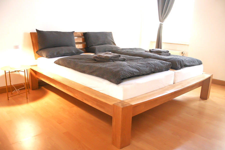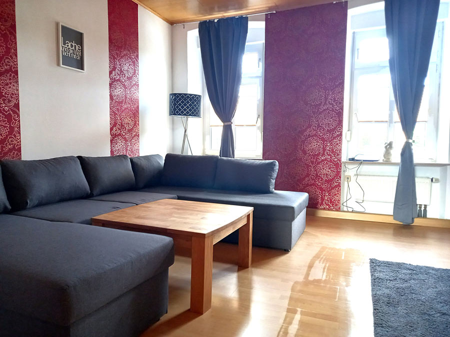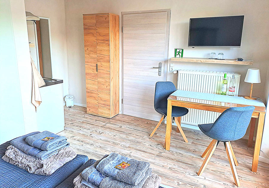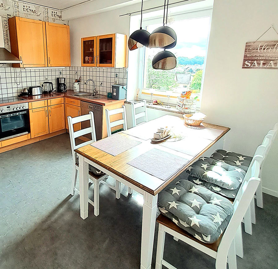 Die Ferienwohnung befindet sich im Obergeschoss und ist treppenläufig zu erreichen. Bestechend ist hier die voll ausgestattete Küche + dem großen Küchentisch, an welchem sich hervorragend die kommenden Touren planen lassen, am Abend gemütliche Brett-/ und Kartenspiele gespielt und traumhafte Sonnenuntergänge beobachtet werden können. Zudem haben Sie, aus dem Küchenfenster geschaut, den Blick auf die alte Stadtmauer sowie den Stadtpark.