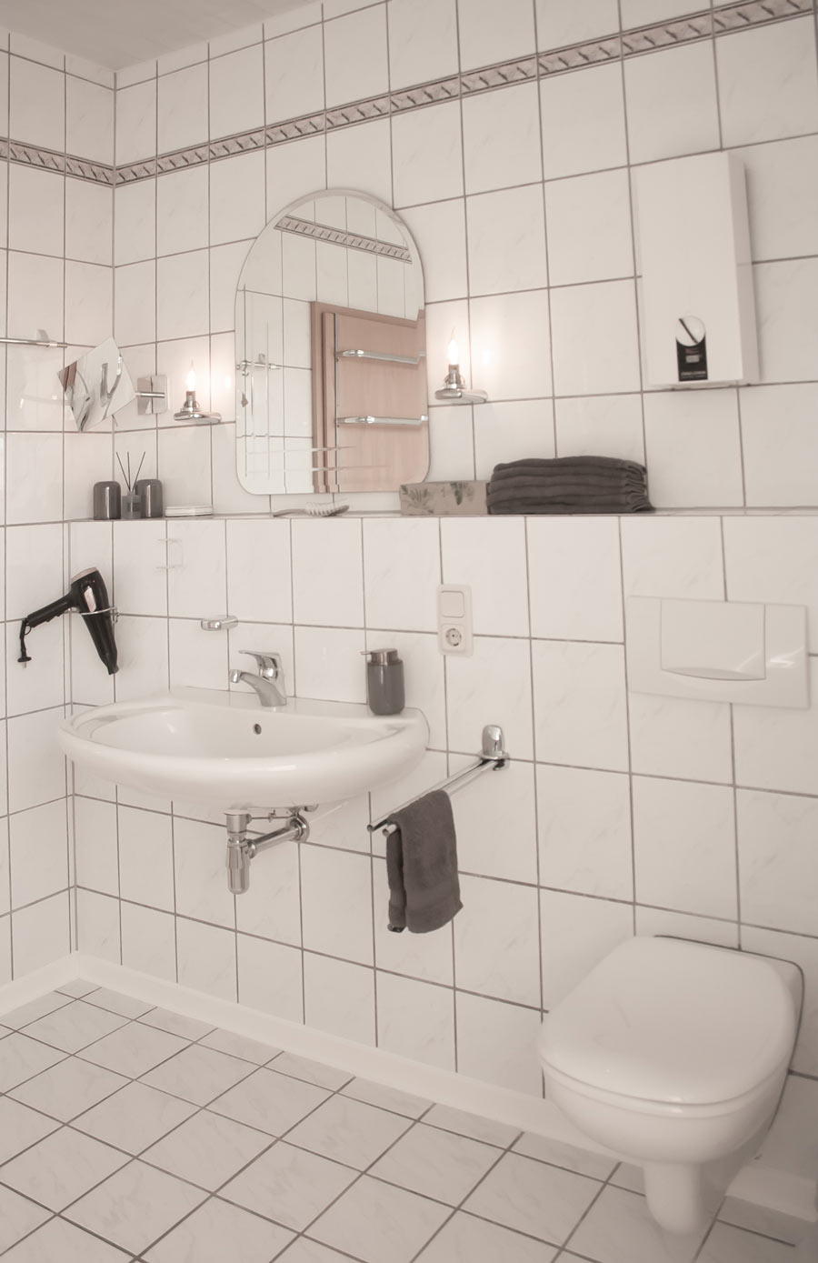 Zum Badezimmerbereich gehören eine Dusche, WC, WB, Fön und Duschbad. Für den Aufenthalt stehen Ihnen jeweils pro Person 1 großes und ein kleines Handtuch zur Verfügung. Das WLAN ist kostenfrei, ein TV ist ebenfalls vorhanden. Ein kleines Notfalllager (Zahnbürsten, Zahnpaste) finden Sie im Flurbereich.